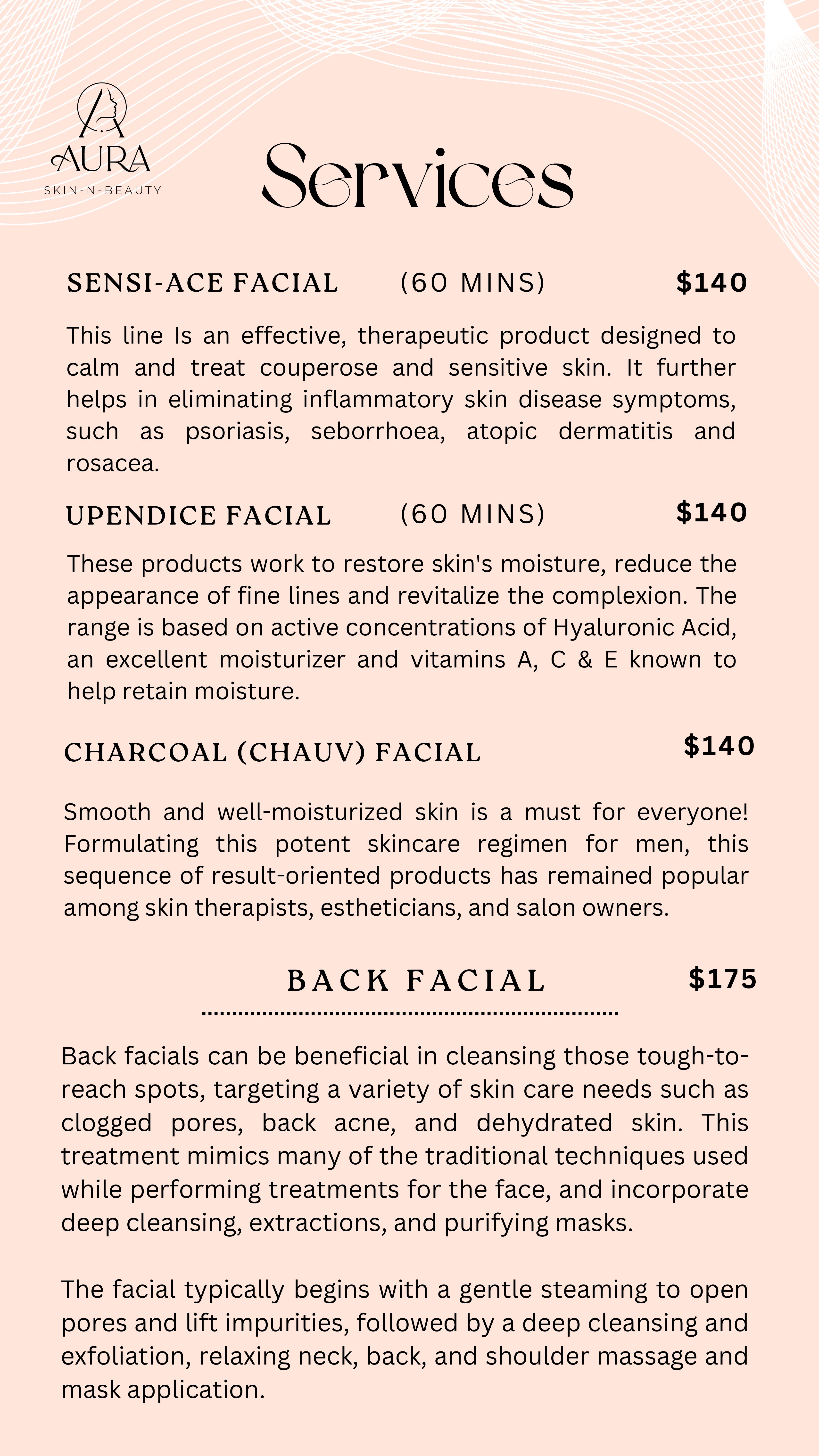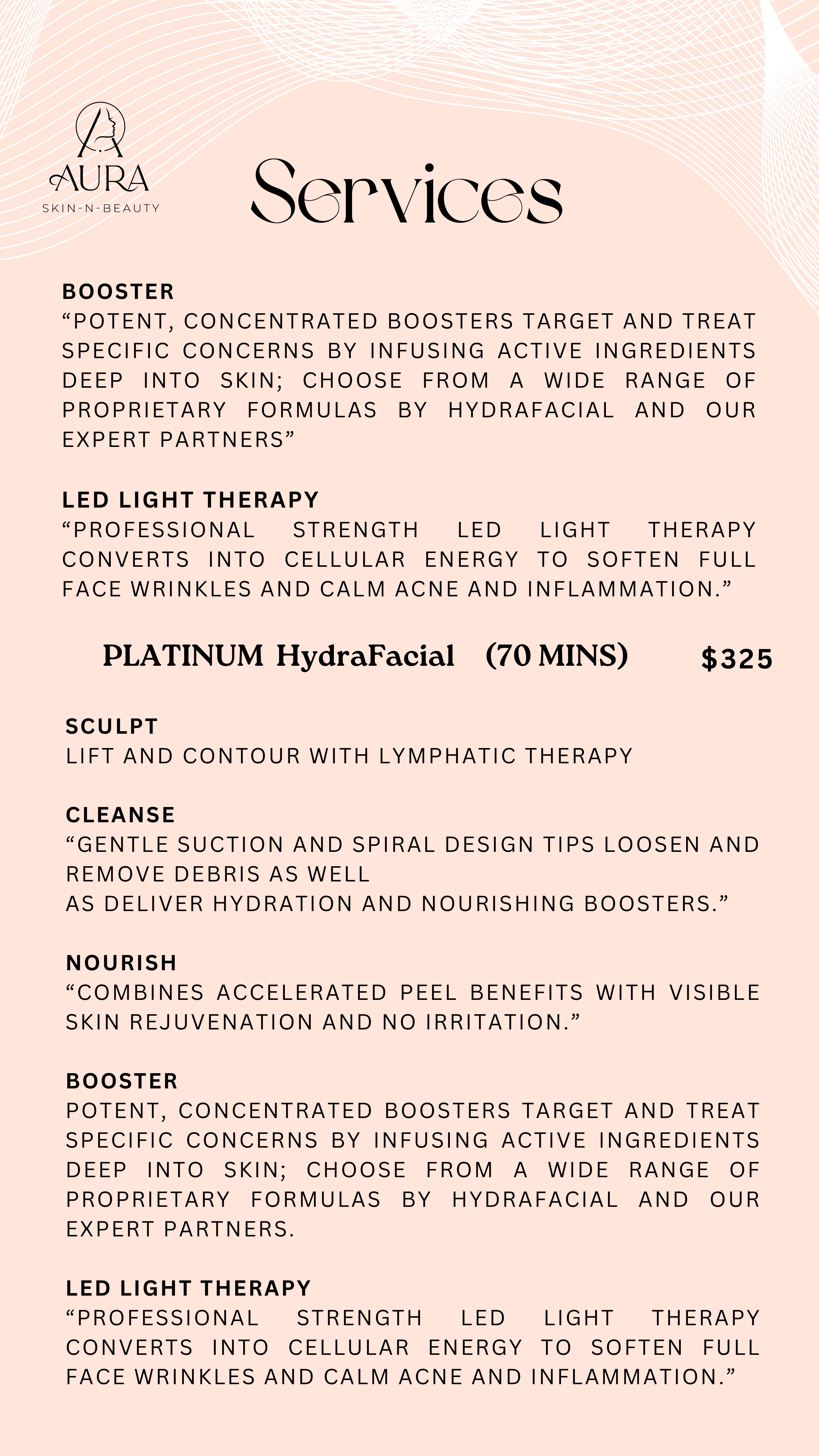 At Aura Skin-N-Beauty, our mission is to enhance natural beauty and boost confidence through expert skincare solutions. We are committed to providing personalized, high-quality treatments in a serene and luxurious environment. By using premium products and advanced techniques, we ensure a rejuvenating experience that nourishes both skin and soul. Our goal is to empower every client with radiant, healthy skin while delivering exceptional care and relaxation. Beyond treatments, we create a serene sanctuary where relaxation meets transformation. Our holistic approach nurtures both skin and soul, empowering every client to feel radiant, rejuvenated, and confident in their own skin. At Aura Skin-N-Beauty, your beauty is our passion, and your glow is our success.