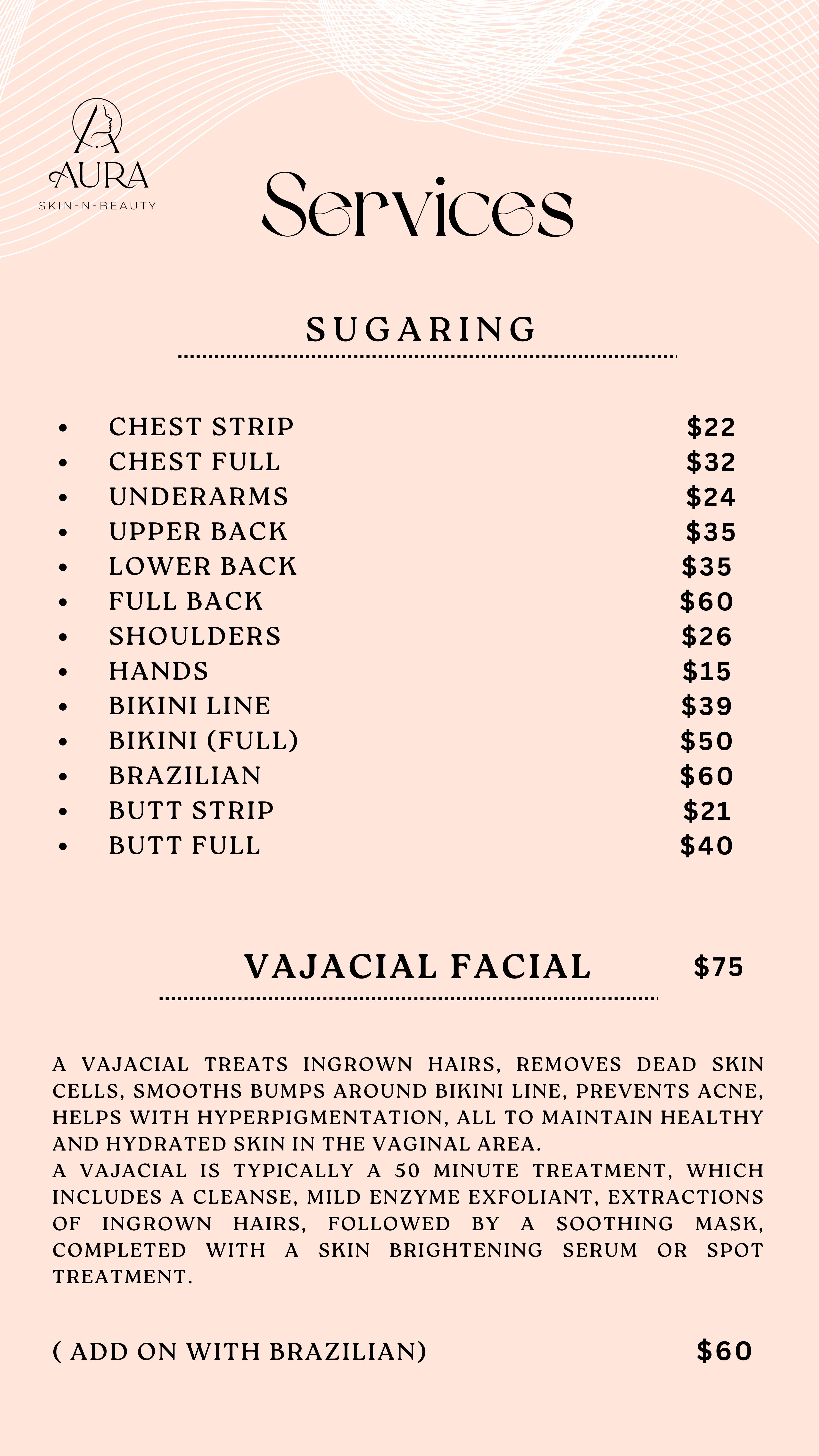 At Aura Skin-N-Beauty, we are dedicated to providing the best sugaring service for our clients, featuring an all-natural alternative to traditional waxing methods. Our treatment is perfect for those seeking a safer skincare routine, as it uses a sugar paste that doesn't contain any harsh chemicals that can irritate the skin. It provides an alternative to waxing, making it perfect for those with sensitive skin. However, we don't just offer sugaring - we are also experts in different skin treatments and waxing services. Our team is skilled in tailoring treatments to your specific needs, giving you the best results possible. We prioritize the comfort and satisfaction of our clients, ensuring that every visit to Aura Skin-N-Beauty is a positive experience. Do not hesitate to contact us to book an appointment!